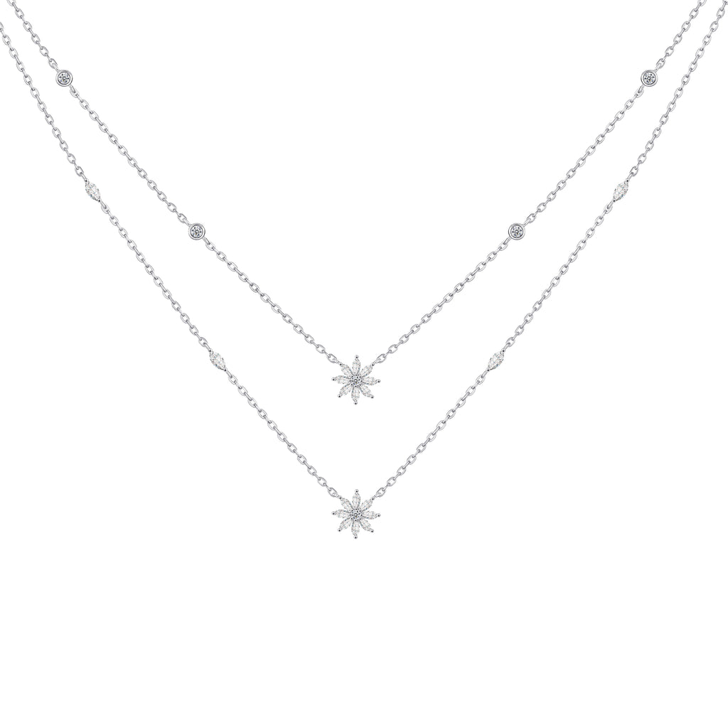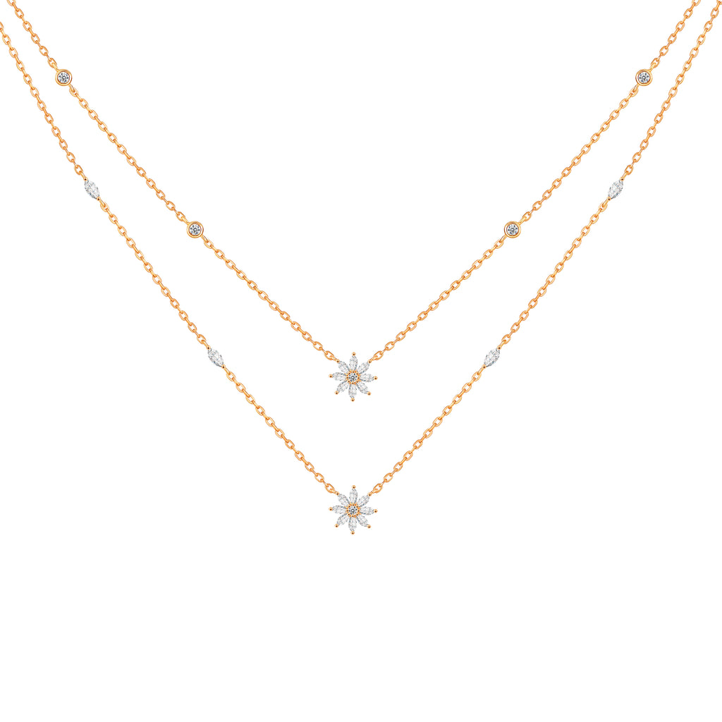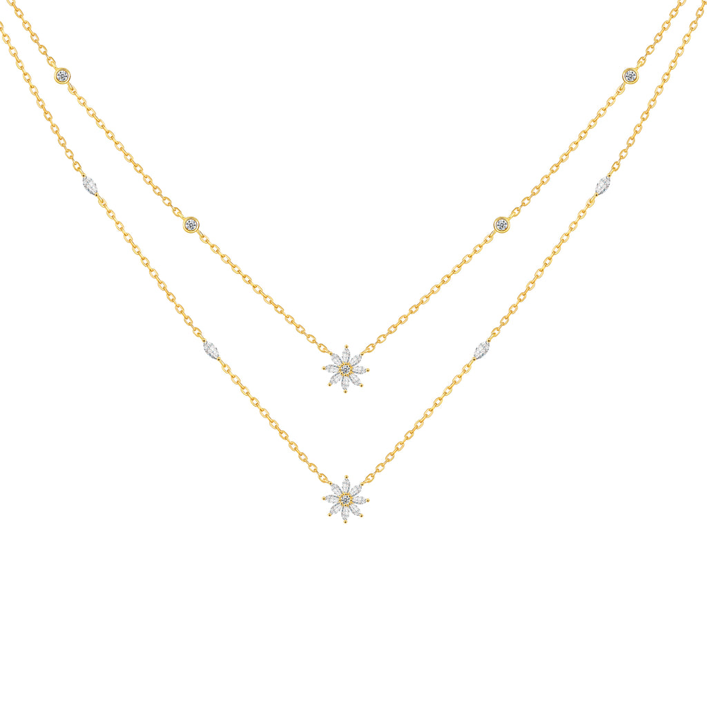 تصنع كل قطعة وفقا لأعلى معايير الجودة وباستخدام أفضل المواد وأعلاها جودة. عقد رقيق وناعم من الفضة مطلي بالذهب عيار 18 يتضمن سلسلتين في منتصف كل منهما فصوص لامعة مرصعة على شكل وردة مع فصوص دائرية موزعة في كل طرف.