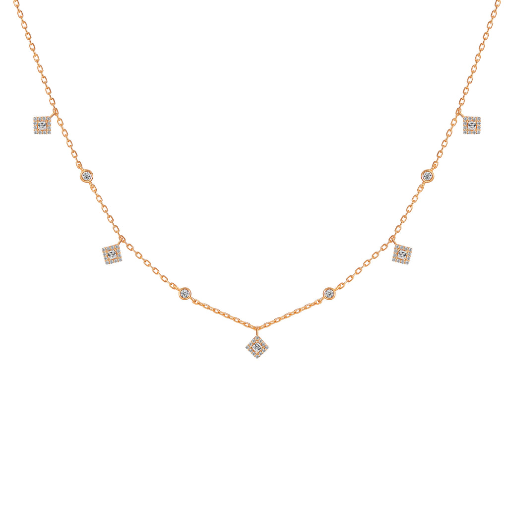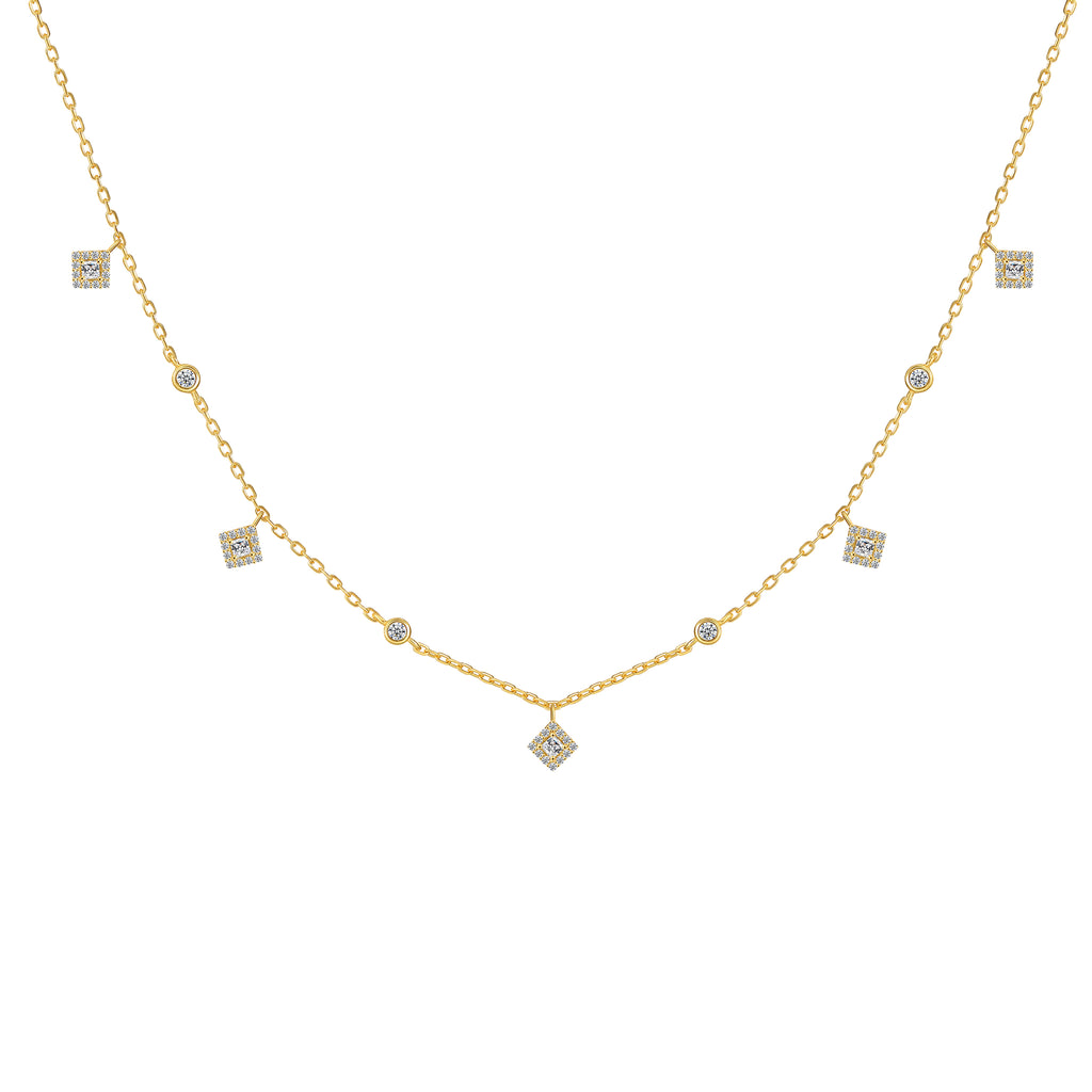 تصنع كل قطعة وفقا لأعلى معايير الجودة وباستخدام أفضل المواد وأعلاها جودة. عقد رقيق وناعم من الفضة مطلي بالذهب عيار 18 مزين بفصوص على شكل معين وأخرى بقصة دائرية متلألئة تطوق عنقك بكل أناقة.