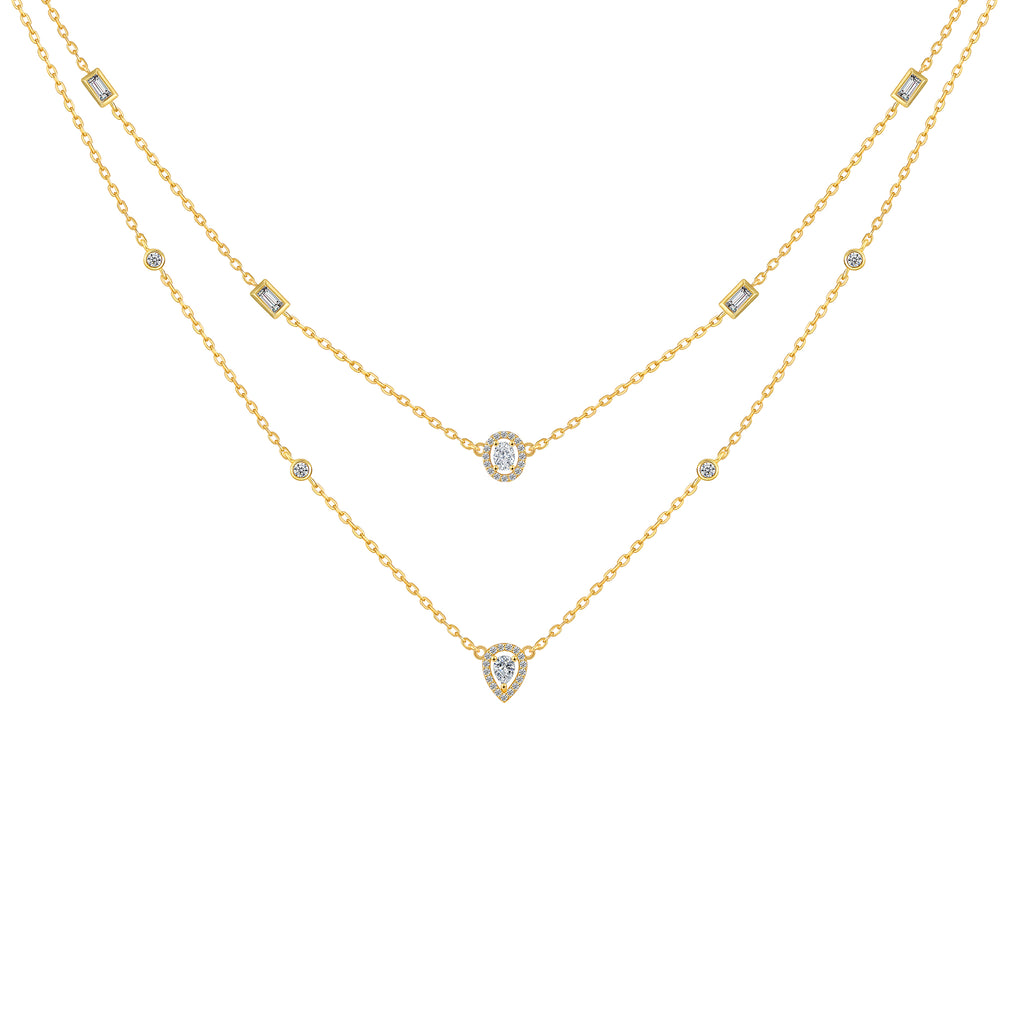 تصنع كل قطعة وفقا لأعلى معايير الجودة وباستخدام أفضل المواد وأعلاها جودة. عقد رقيق وناعم من الفضة مطلي بالذهب عيار 18 يتضمن سلسلتين في منتصف كل منهما فصوص لامعة مرصعة على شكل قصة كمثرى والأخرى دائرية مع فصوص حرة موزعة في كل طرف.