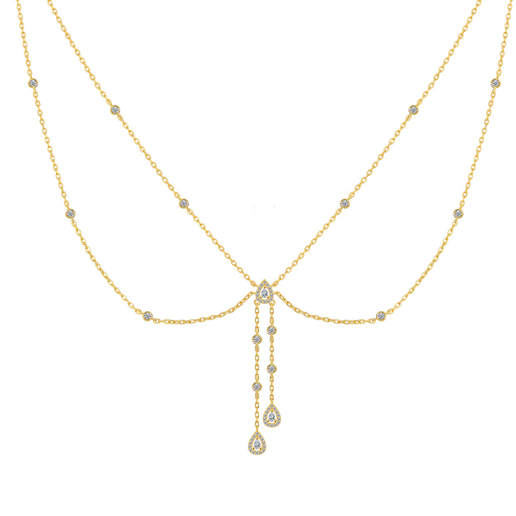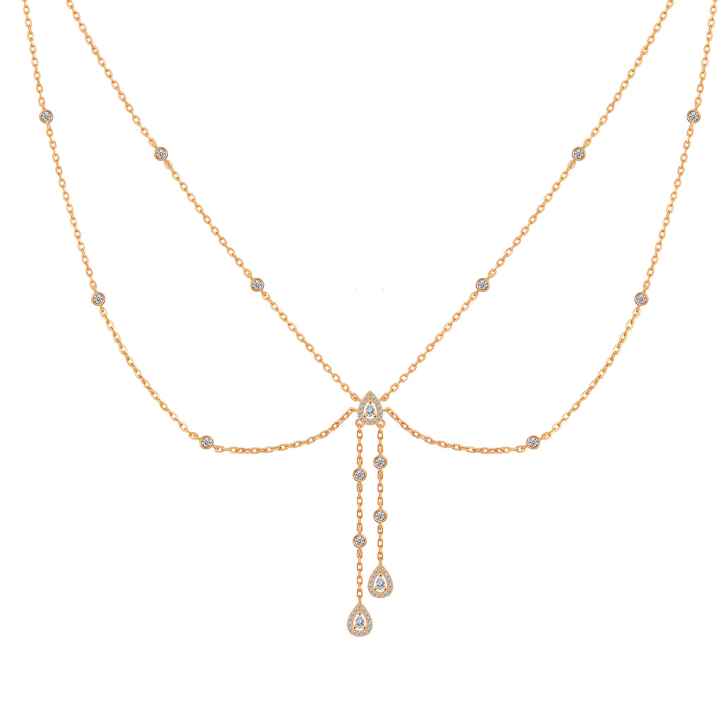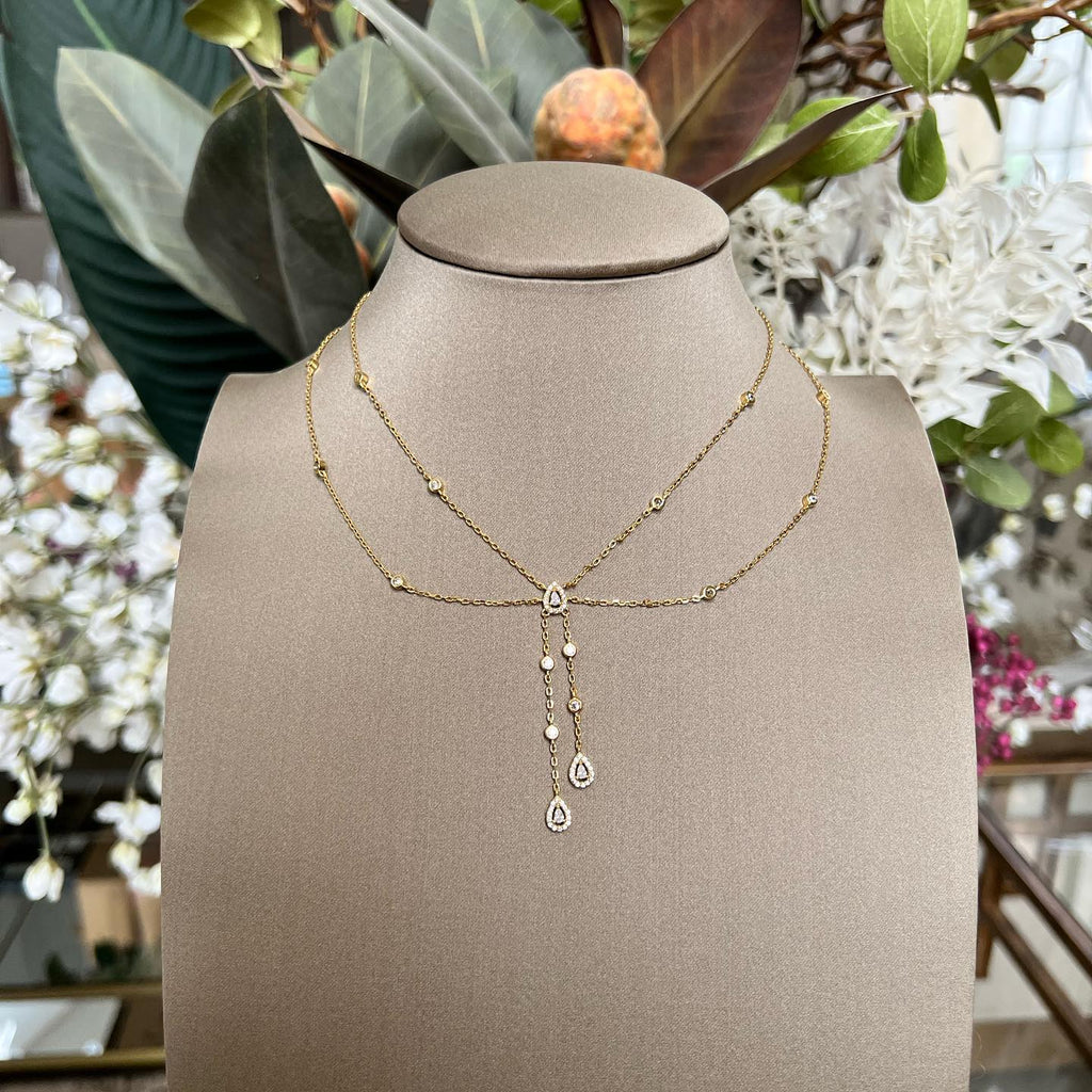 تصنع كل قطعة وفقا لأعلى معايير الجودة وباستخدام أفضل المواد وأعلاها جودة. عقد رقيق وناعم من الفضة مطلي بالذهب عيار 18 يتضمن سلسلتين في منتصف كل منهما فصوص لامعة مرصعة على شكل قصة أجاصة مع فصوص دائرية موزعة في كل طرف.
