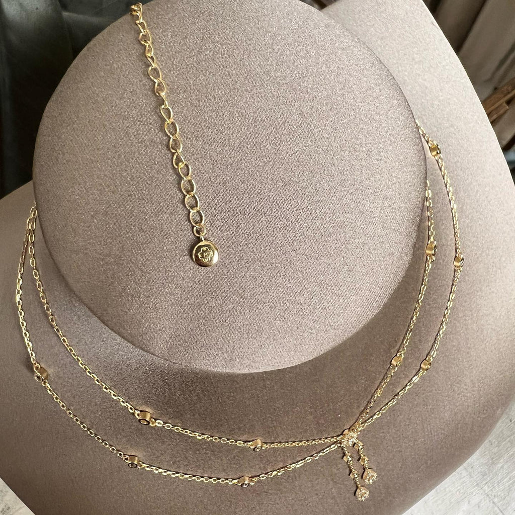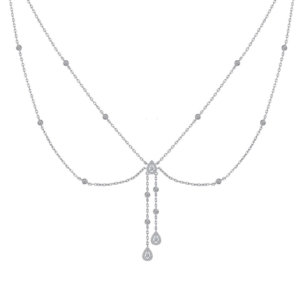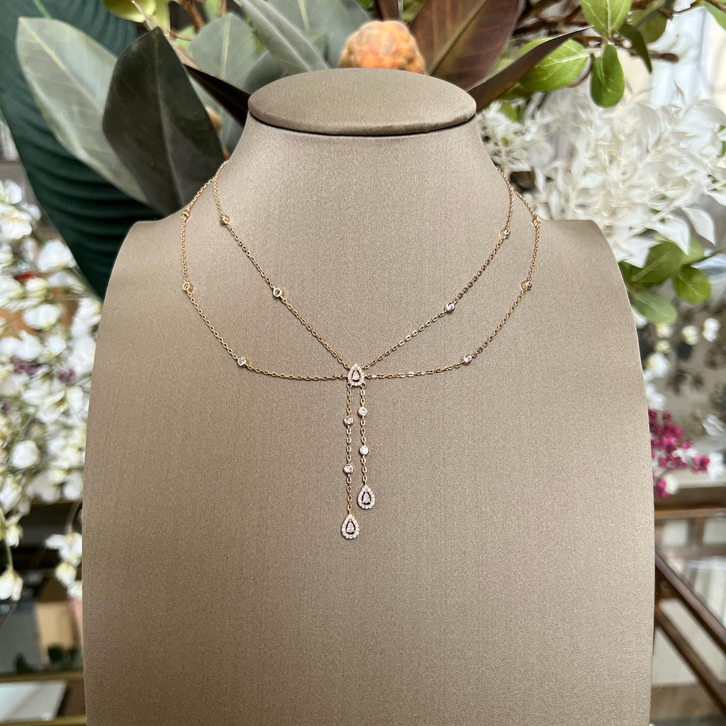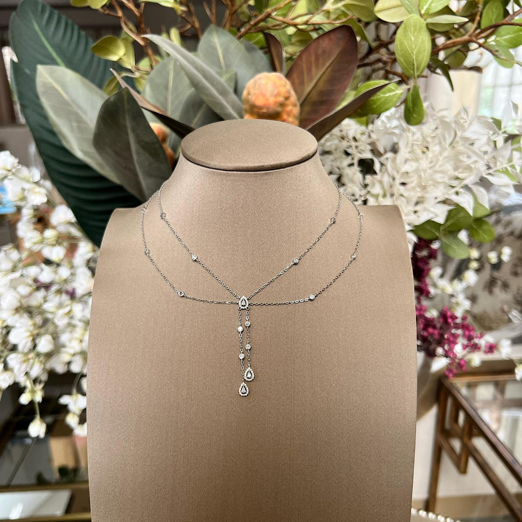تصنع كل قطعة وفقا لأعلى معايير الجودة وباستخدام أفضل المواد وأعلاها جودة. عقد رقيق وناعم من الفضة مطلي بالذهب عيار 18 يتضمن سلسلتين في منتصف كل منهما فصوص لامعة مرصعة على شكل قصة أجاصة مع فصوص دائرية موزعة في كل طرف.