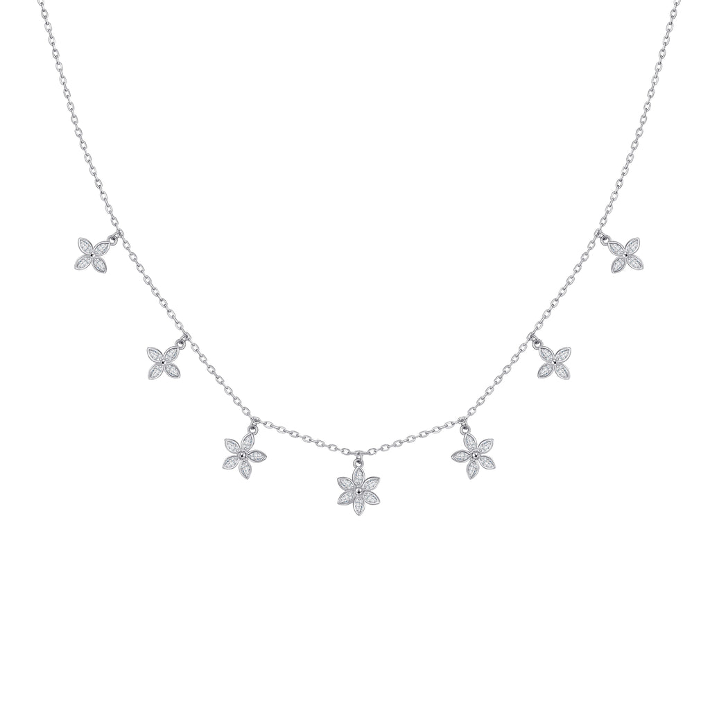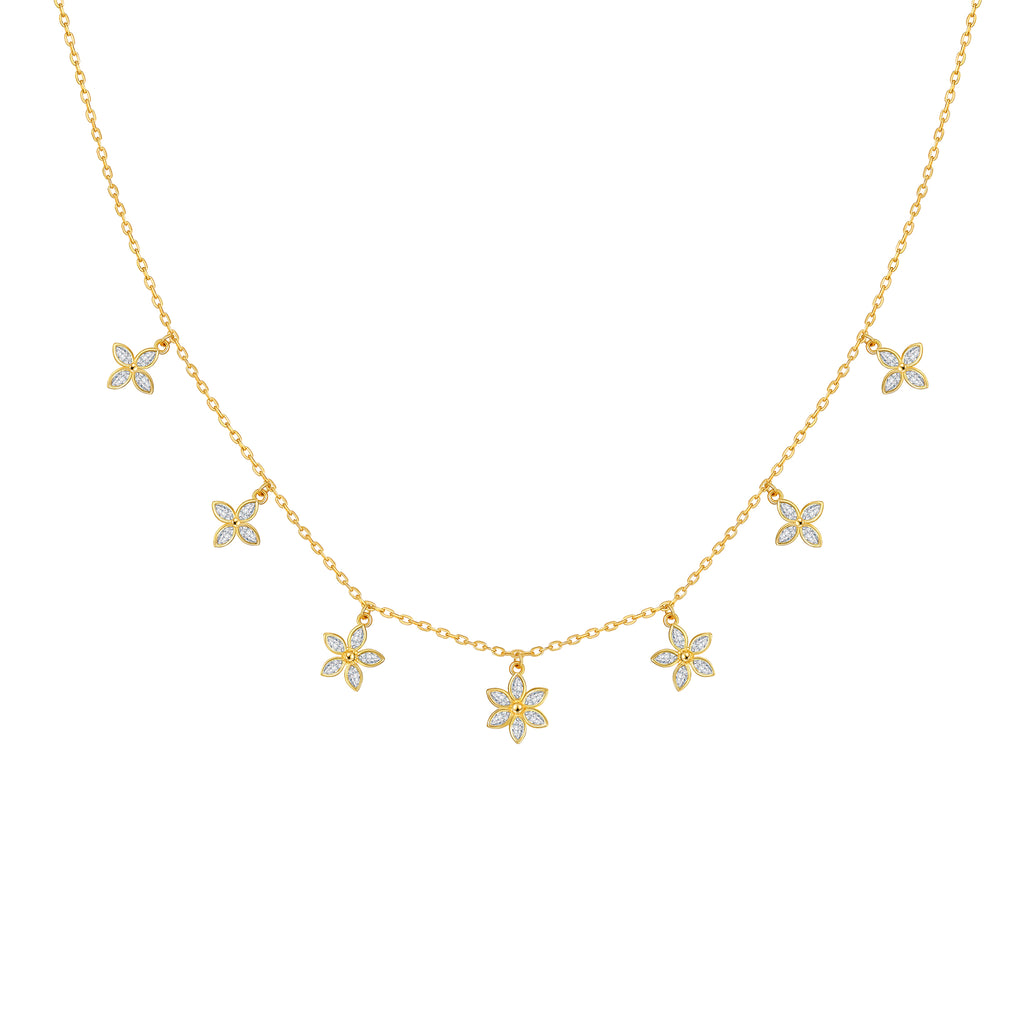 تصنع كل قطعة وفقا لأعلى معايير الجودة وباستخدام أفضل المواد وأعلاها جودة. عقد رقيق وناعم من الفضة مطلي بالذهب عيار 18 مزين بالفصوص اللامعة المرصعة على شكل ورود.