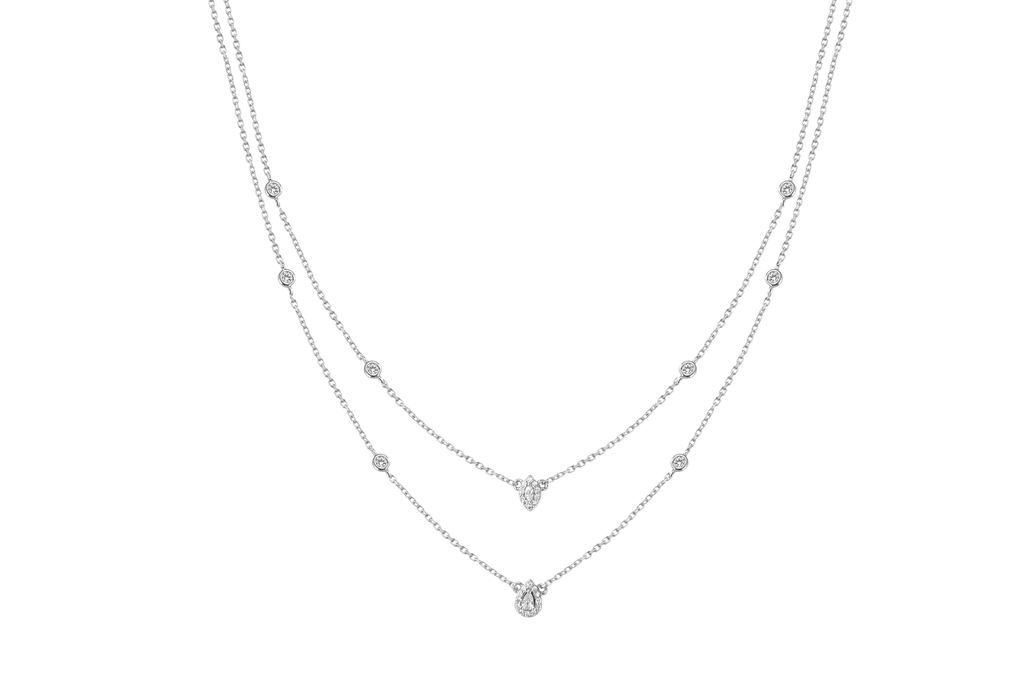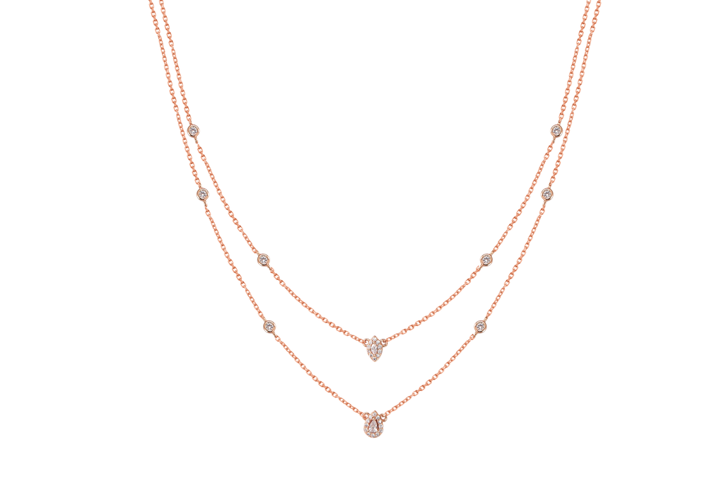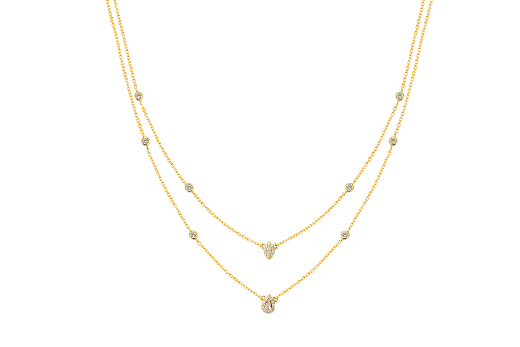 تصنع كل قطعة وفقا لأعلى معايير الجودة وباستخدام أفضل المواد وأعلاها جودة. عقد رقيق وناعم من الفضة مطلي بالذهب عيار 18 يتضمن سلسلتين في منتصف كل منهما فصوص لامعة مرصعة على شكل قصة كمثرى والأخرى دائرية مع فصوص حرة موزعة في كل طرف.