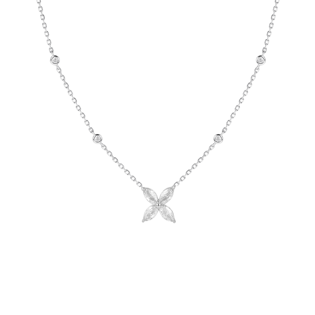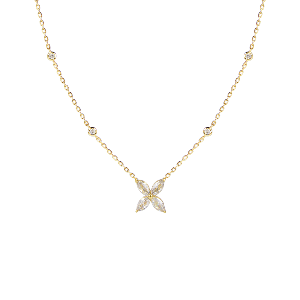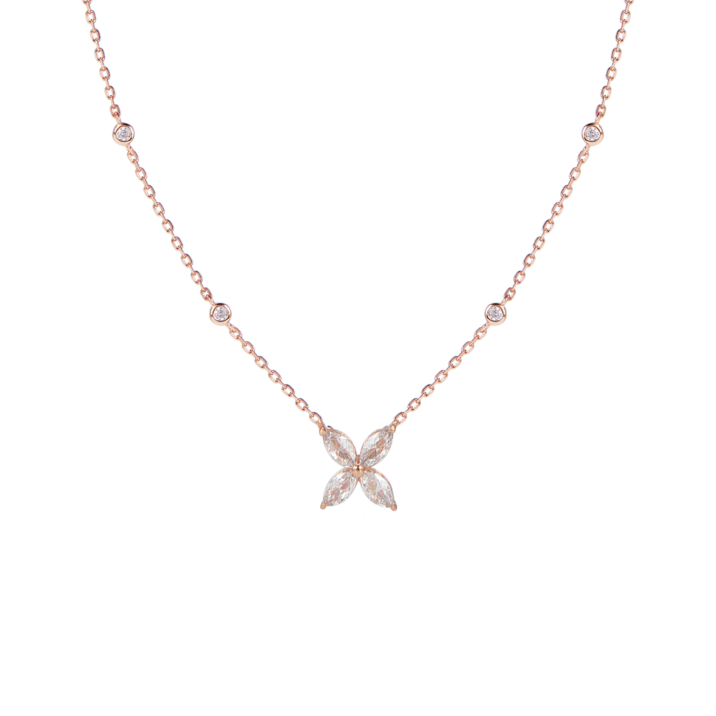 تصنع كل قطعة وفقا لأعلى معايير الجودة وباستخدام أفضل المواد وأعلاها جودة. عقد رقيق وناعم من الفضة مطلي بالذهب عيار 18 مزين بفصوص على شكل وردة متألقة.
