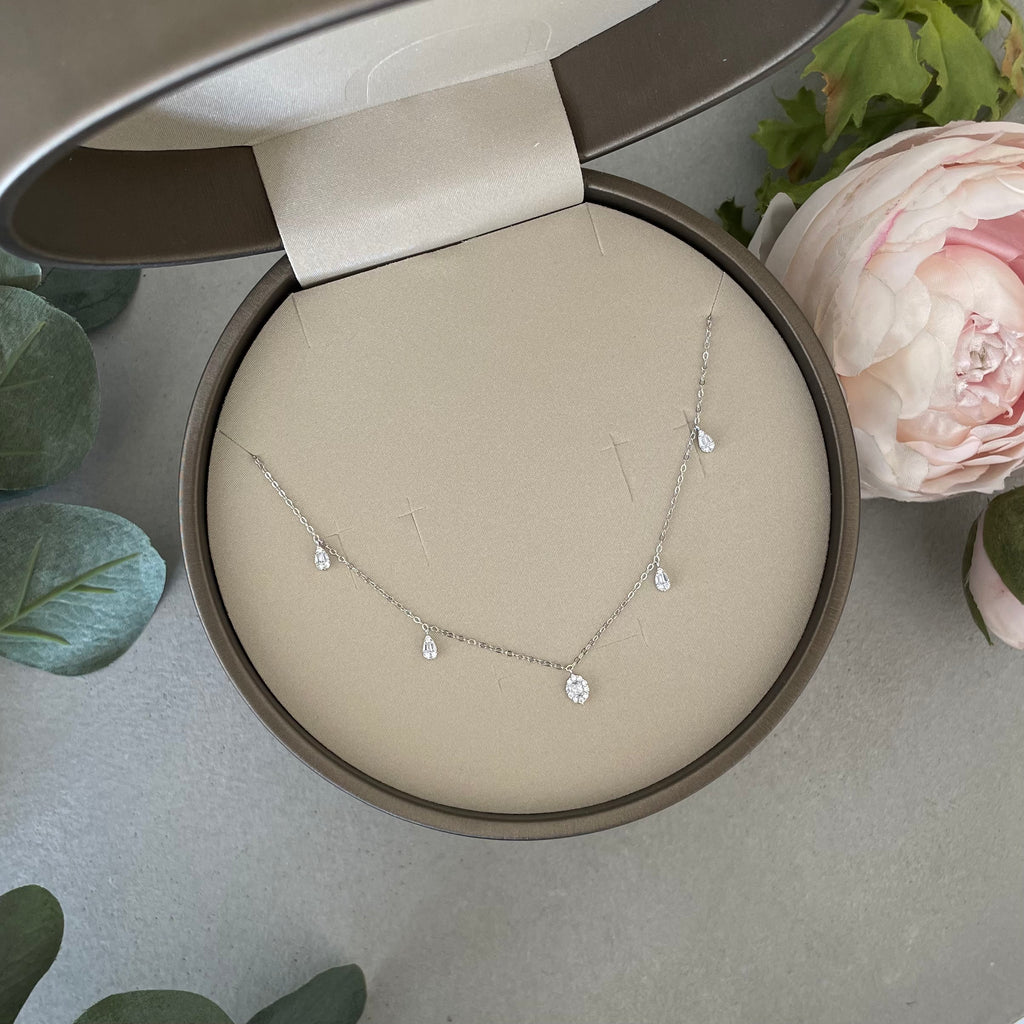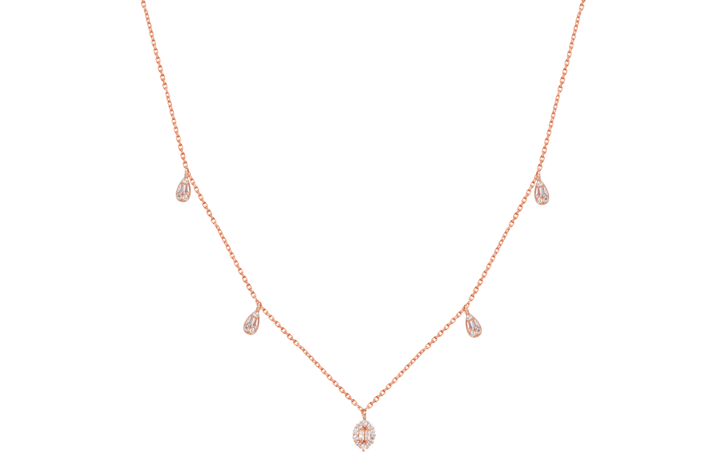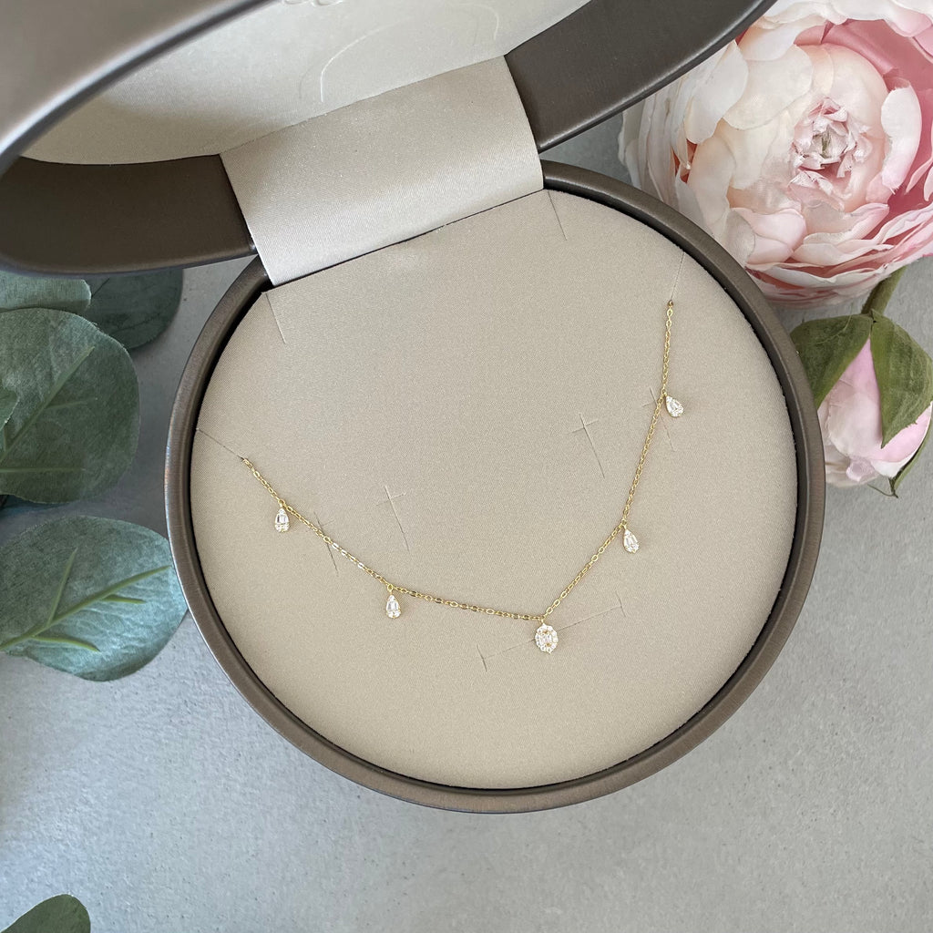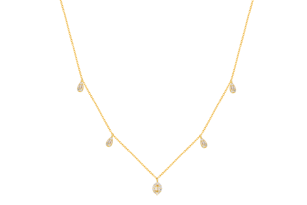 تصنع كل قطعة وفقا لأعلى معايير الجودة وباستخدام أفضل المواد وأعلاها جودة. عقد رقيق وناعم من الفضة مطلي بالذهب عيار 18 مزين بالفصوص المتألقة بقصة الدمعة مع فص أنيق في المنتصف.
