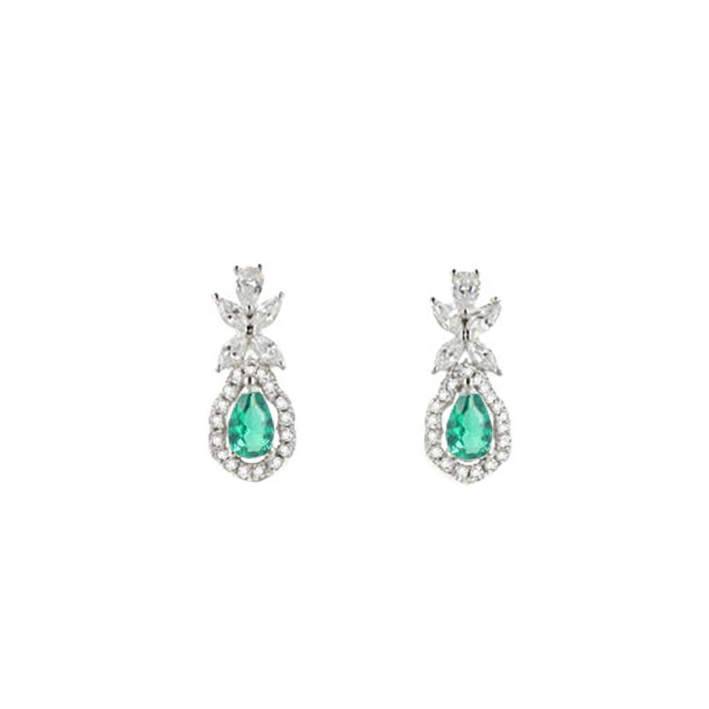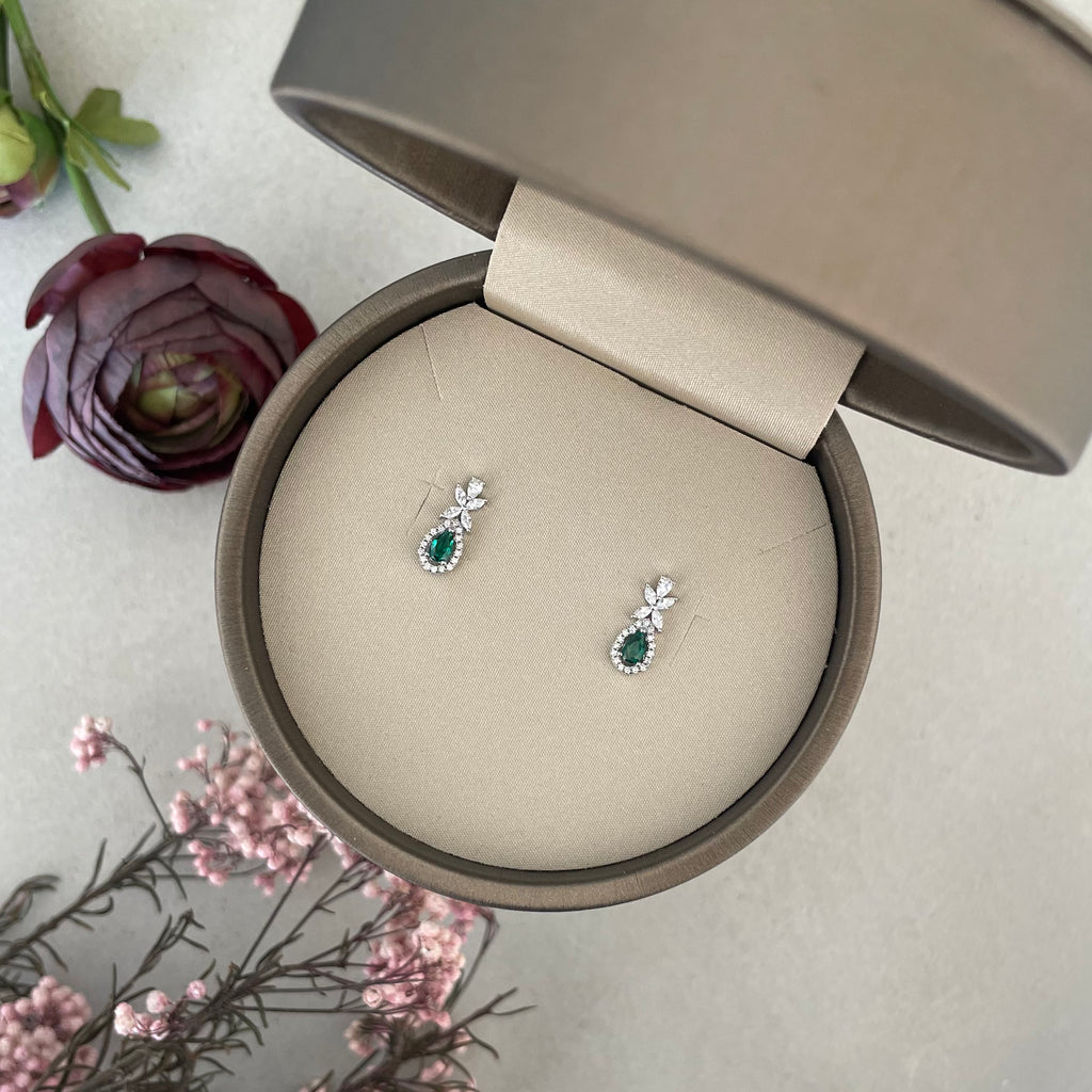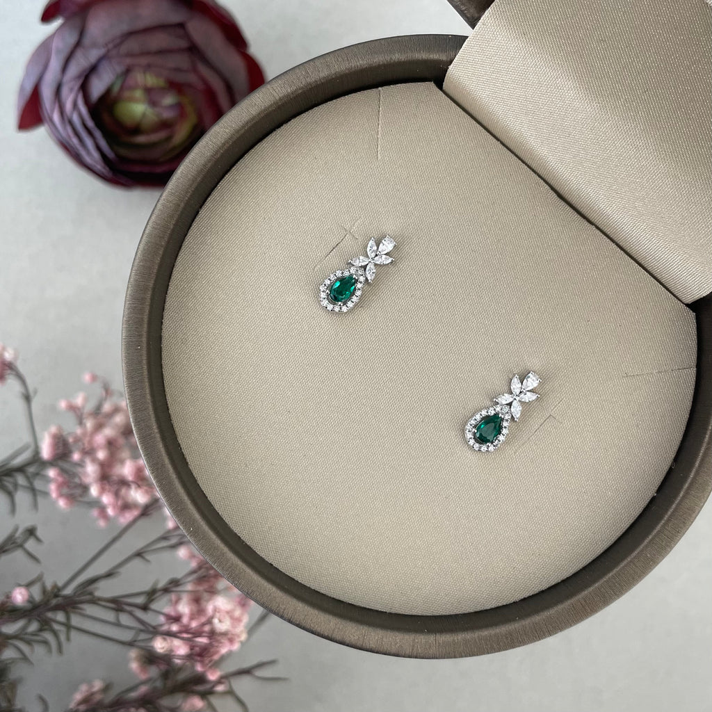 تصنع كل قطعة وفقا لأعلى معايير الجودة وباستخدام أفضل المواد وأعلاها جودة. أقراط بتصميم أنيق وناعم من الفضة مطلية بالذهب عيار 18 قيراط ومزينة بفص ملون بقصة الزمرد في المنتصف.