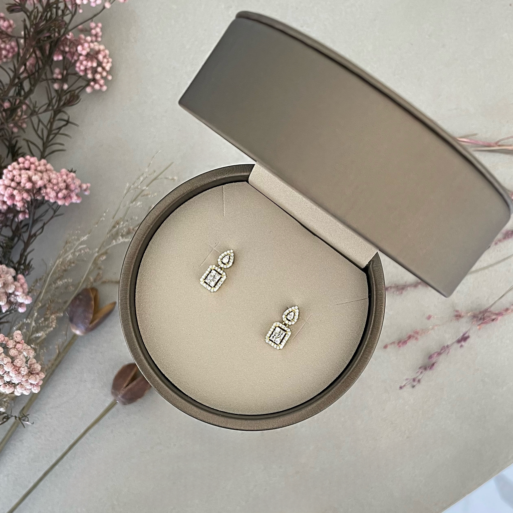 تصنع كل قطعة وفقا لأعلى معايير الجودة وباستخدام أفضل المواد وأعلاها جودة. أقراط بتصميم أنيق وناعم من الفضة مطلية بالذهب عيار 18 قيراط ومزينة بفص في المنتصف.
