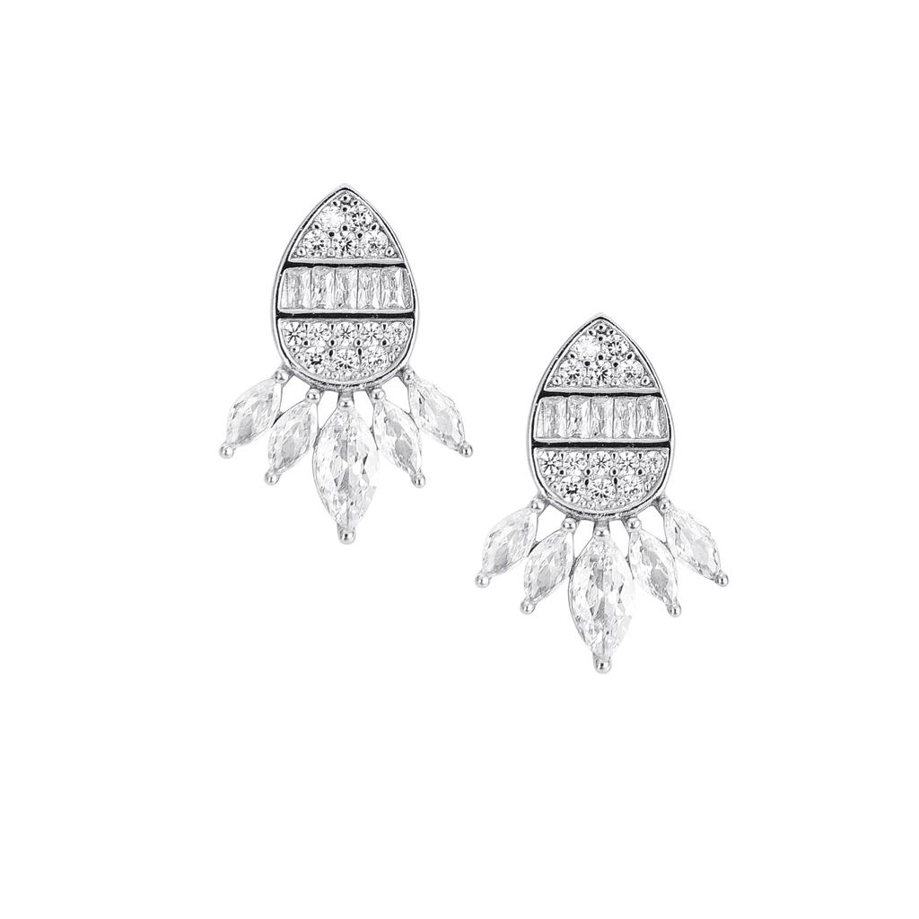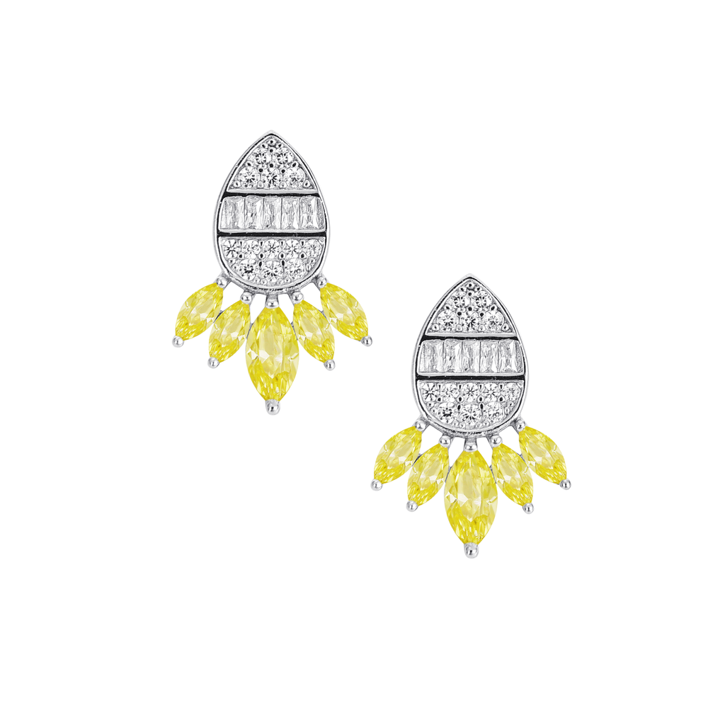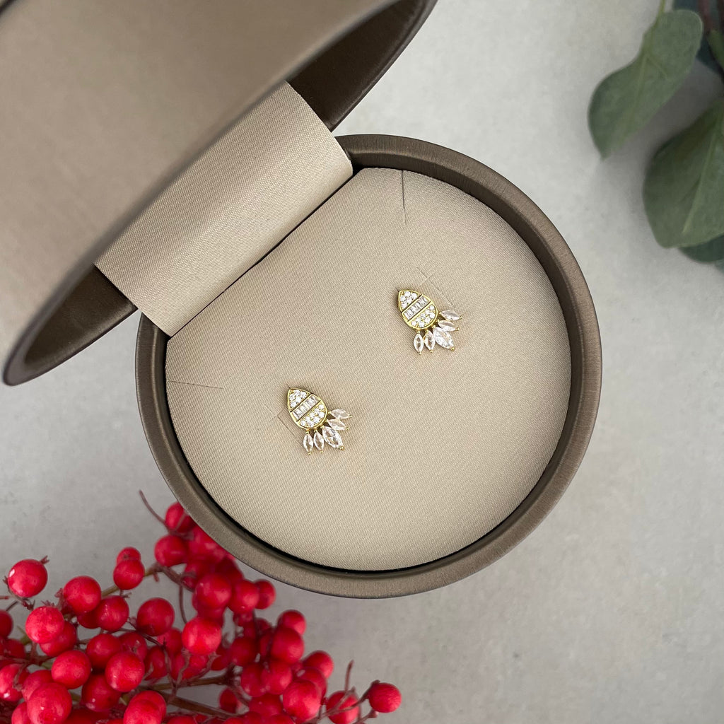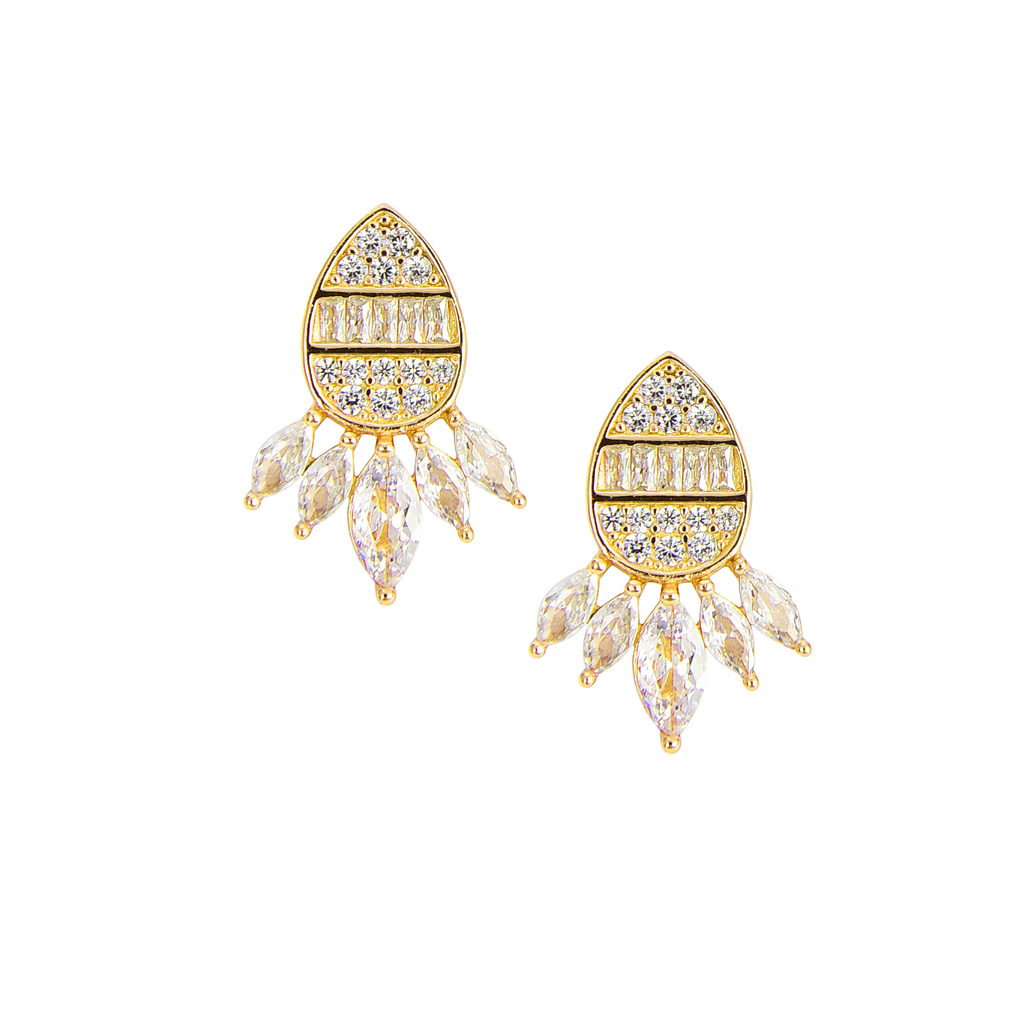 تصنع كل قطعة وفقا لأعلى معايير الجودة وباستخدام أفضل المواد وأعلاها جودة. أقراط بتصميم أنيق وناعم من الفضة مطلية بالذهب عيار 18 قيراط ومزينة بفص في المنتصف.