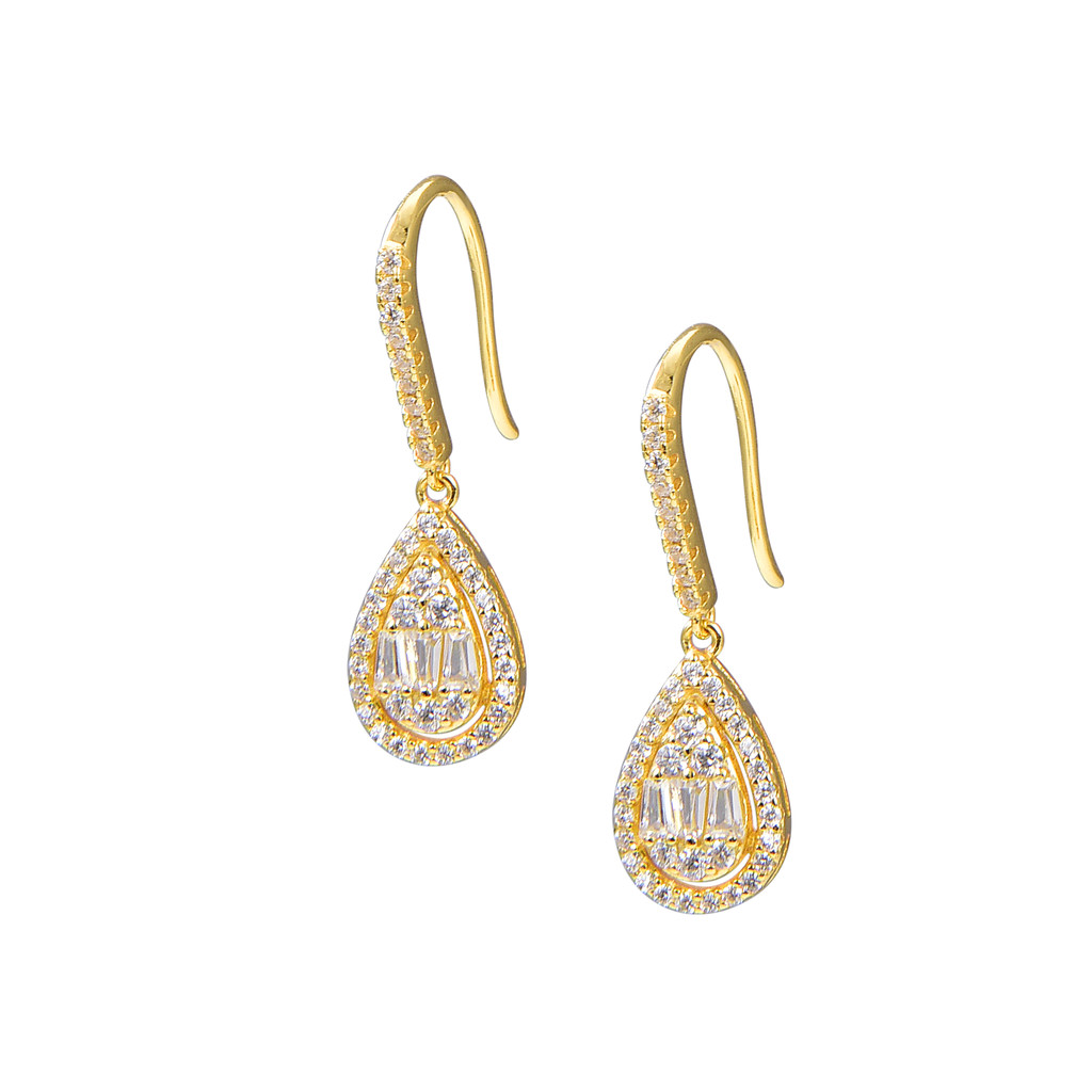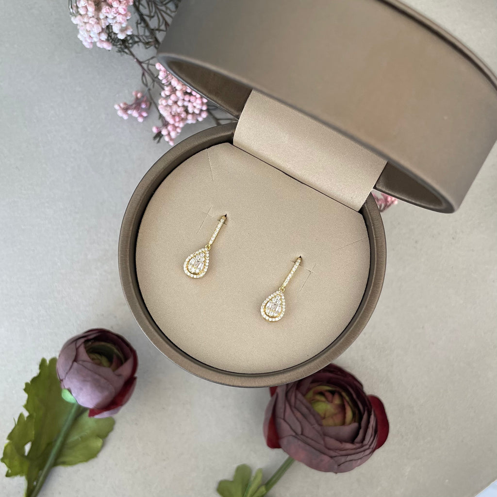 تصنع كل قطعة وفقا لأعلى معايير الجودة وباستخدام أفضل المواد وأعلاها جودة. أقراط بتصميم أنيق وناعم من الفضة مطلية بالذهب عيار 18 قيراط ومزينة بفص في المنتصف.