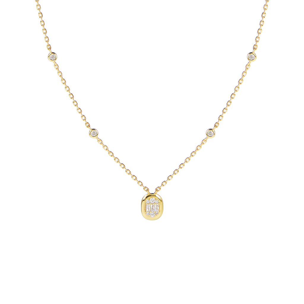 تصنع كل قطعة وفقا لأعلى معايير الجودة وباستخدام أفضل المواد وأعلاها جودة. عقد رقيق وناعم من الفضة مطلي بالذهب عيار 18 مزين بفصوص ع دائرية متلألئة تطوق قلادة لامعة بكل أناقة .