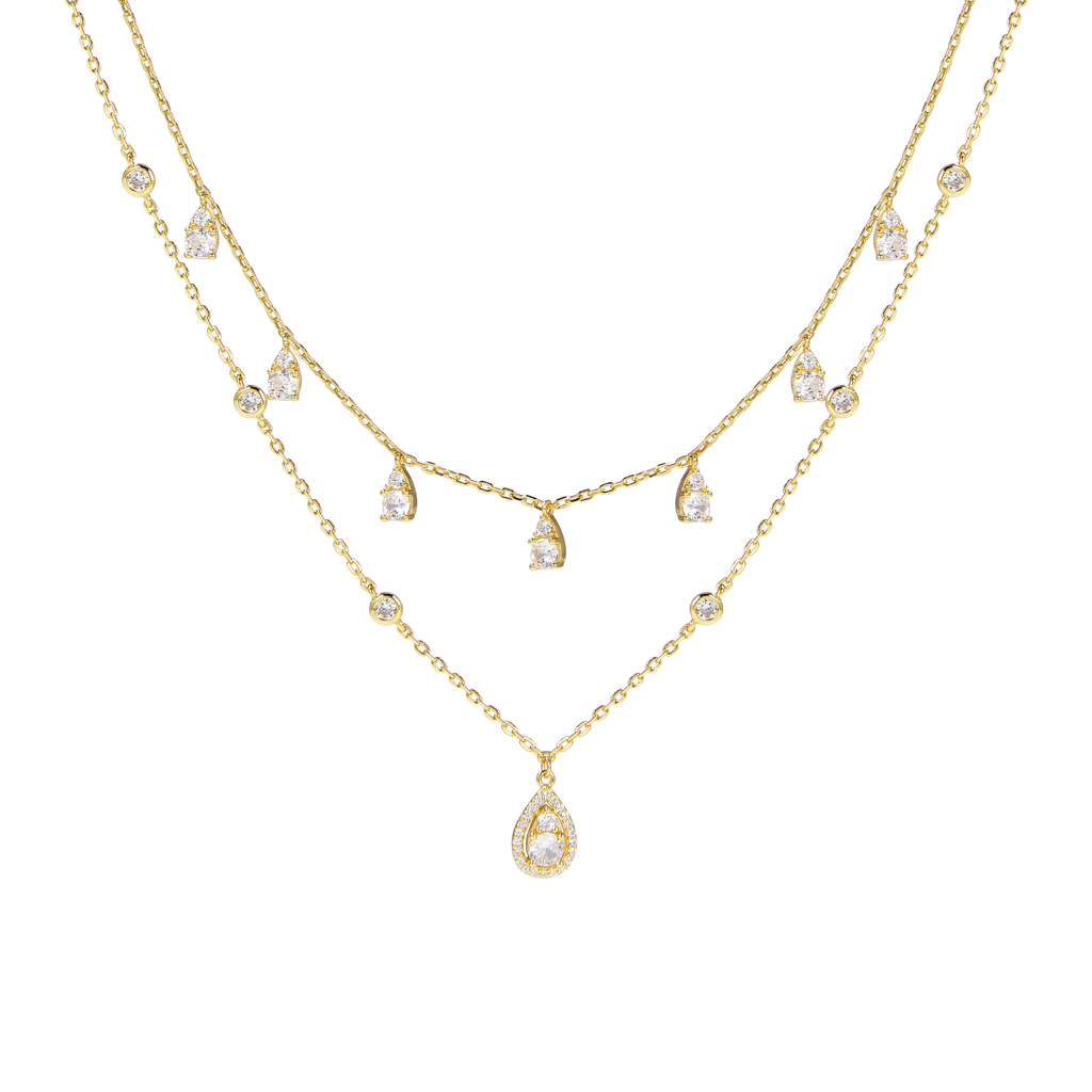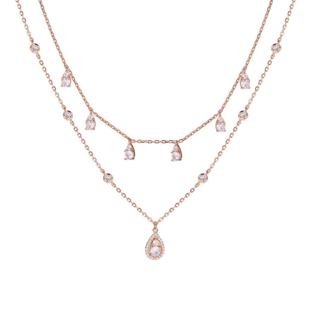 تصنع كل قطعة وفقا لأعلى معايير الجودة وباستخدام أفضل المواد وأعلاها جودة. عقد رقيق وناعم من الفضة مطلي بالذهب عيار 18 مزين بفصوص ع دائرية متلألئة تطوق قلادة لامعة بكل أناقة .