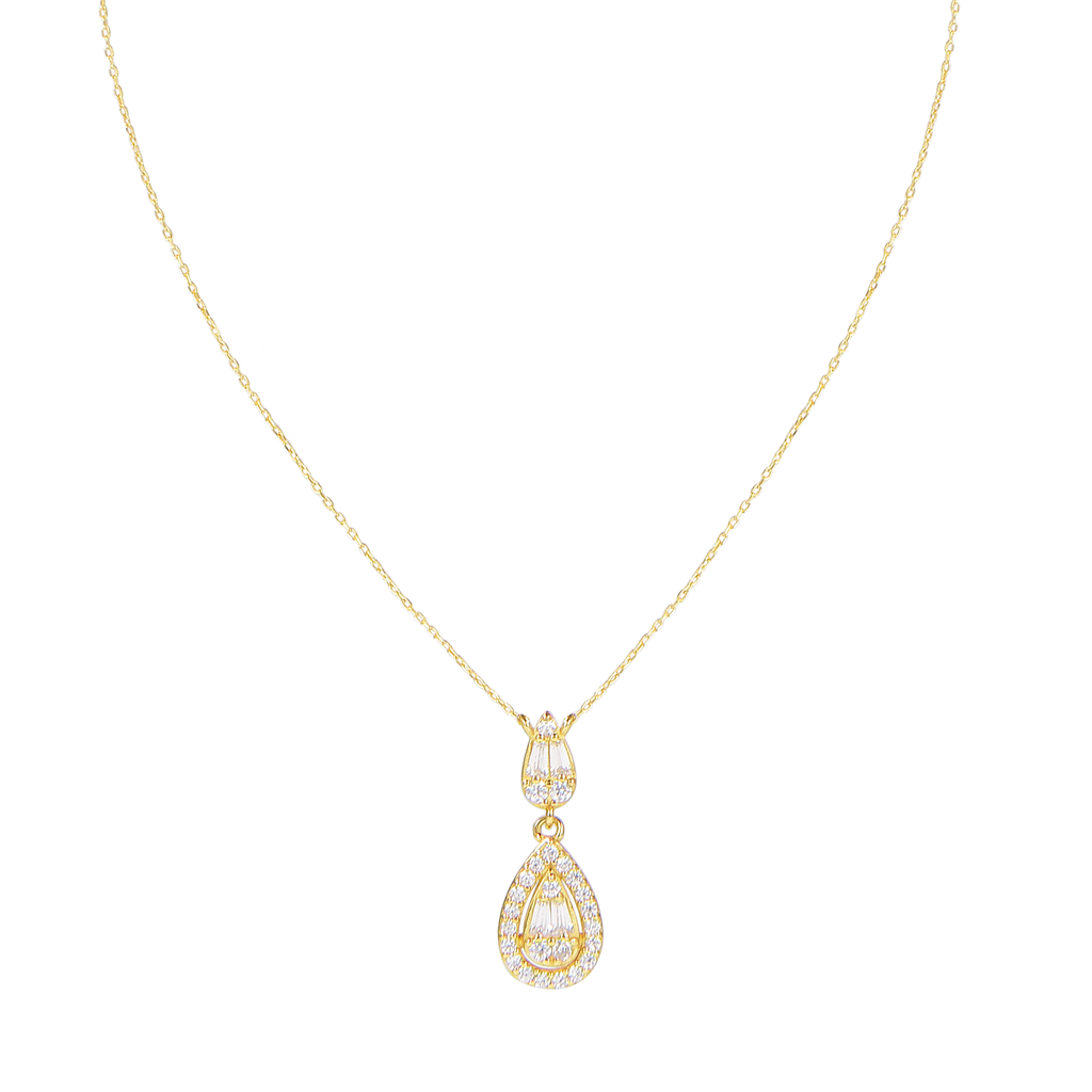 تصنع كل قطعة وفقا لأعلى معايير الجودة وباستخدام أفضل المواد وأعلاها جودة. عقد رقيق وناعم من الفضة مطلي بالذهب عيار 18 مزين بفصوص ع دائرية متلألئة تطوق قلادة لامعة بكل أناقة .