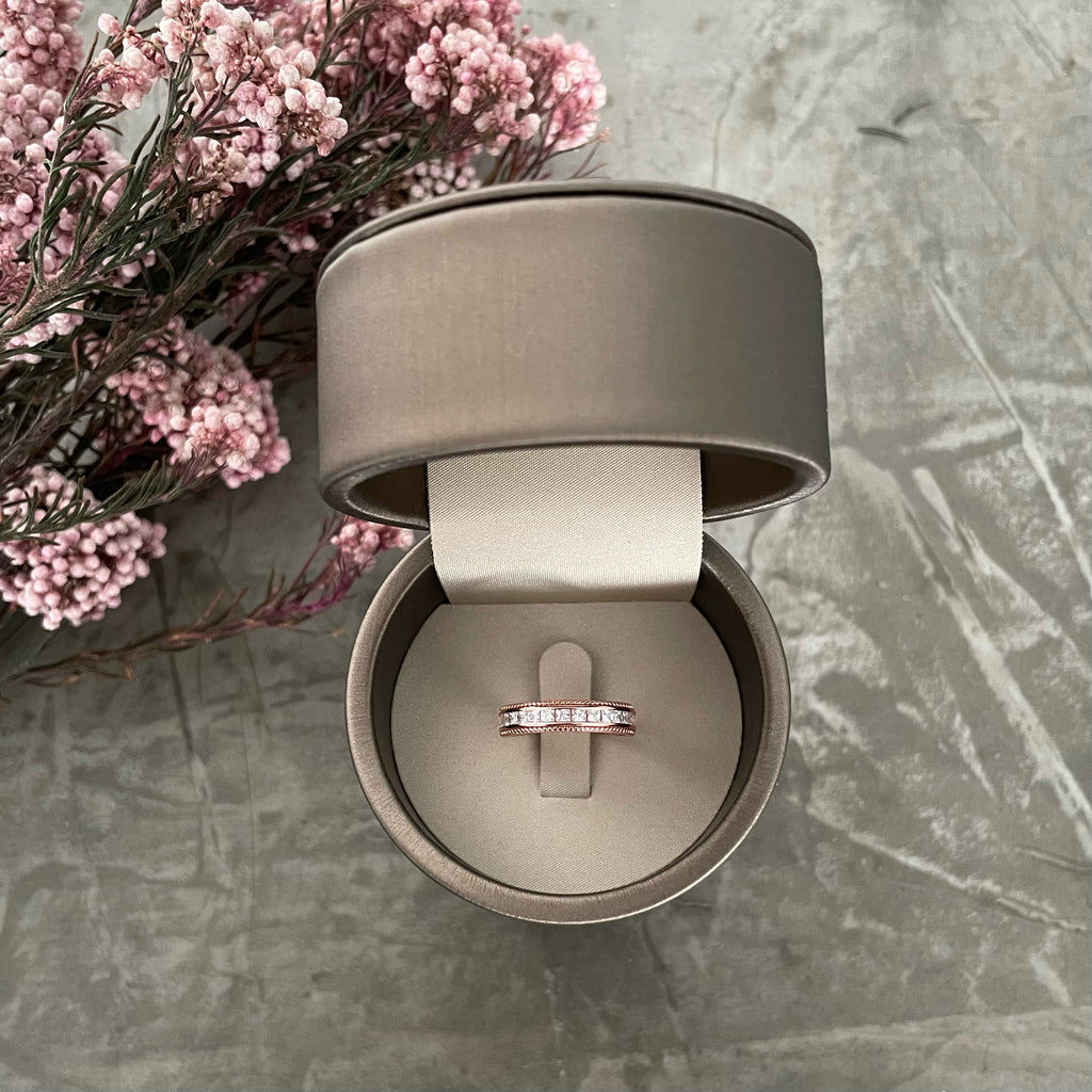 تصنع كل قطعة وفقا لأعلى معايير الجودة وباستخدام أفضل المواد وأعلاها جودة. هذه القطعة عبارة عن خاتم مطلي بالذهب عيار 18 قيراط بخطين متلألئين مع زركون على شكل ورده في المنتصف.