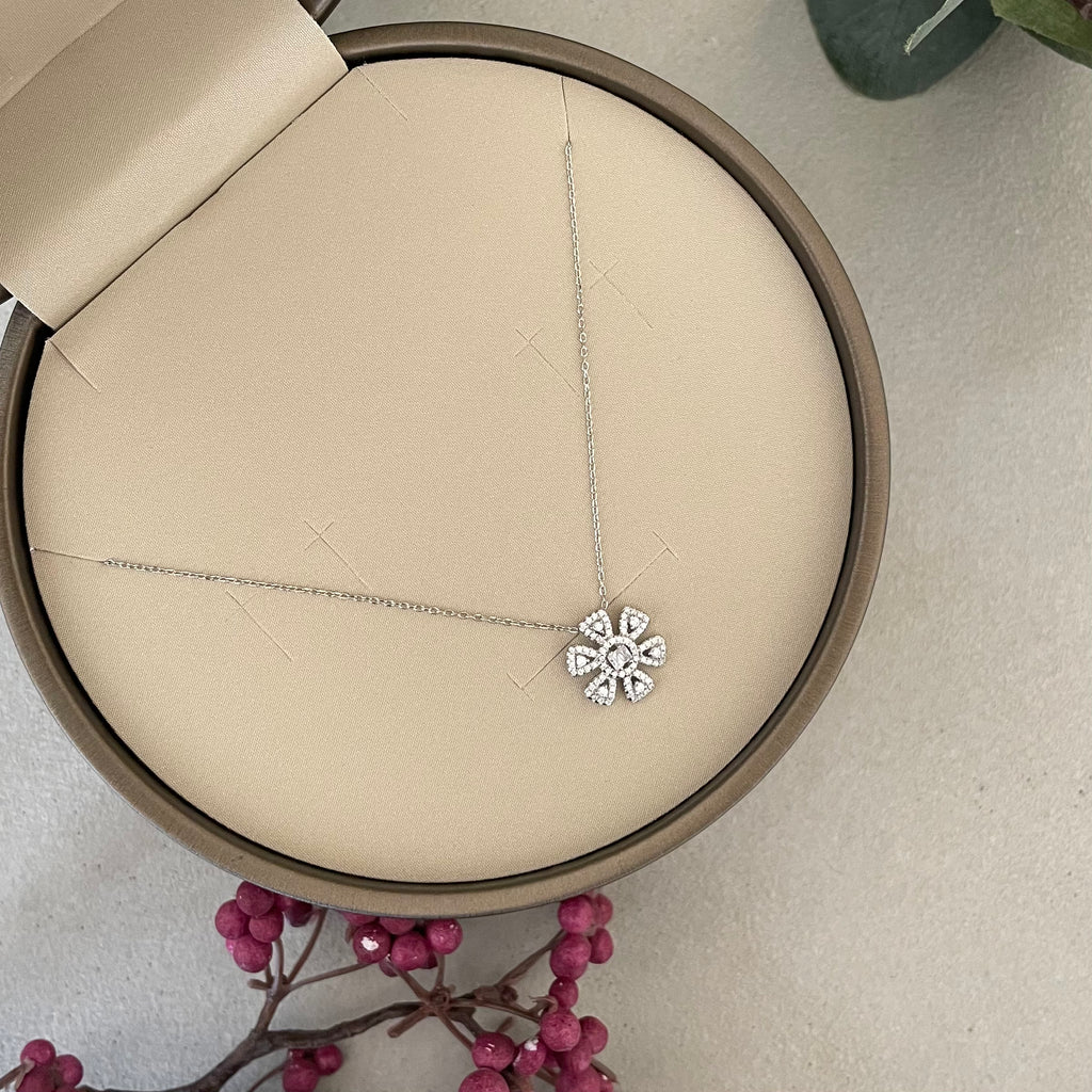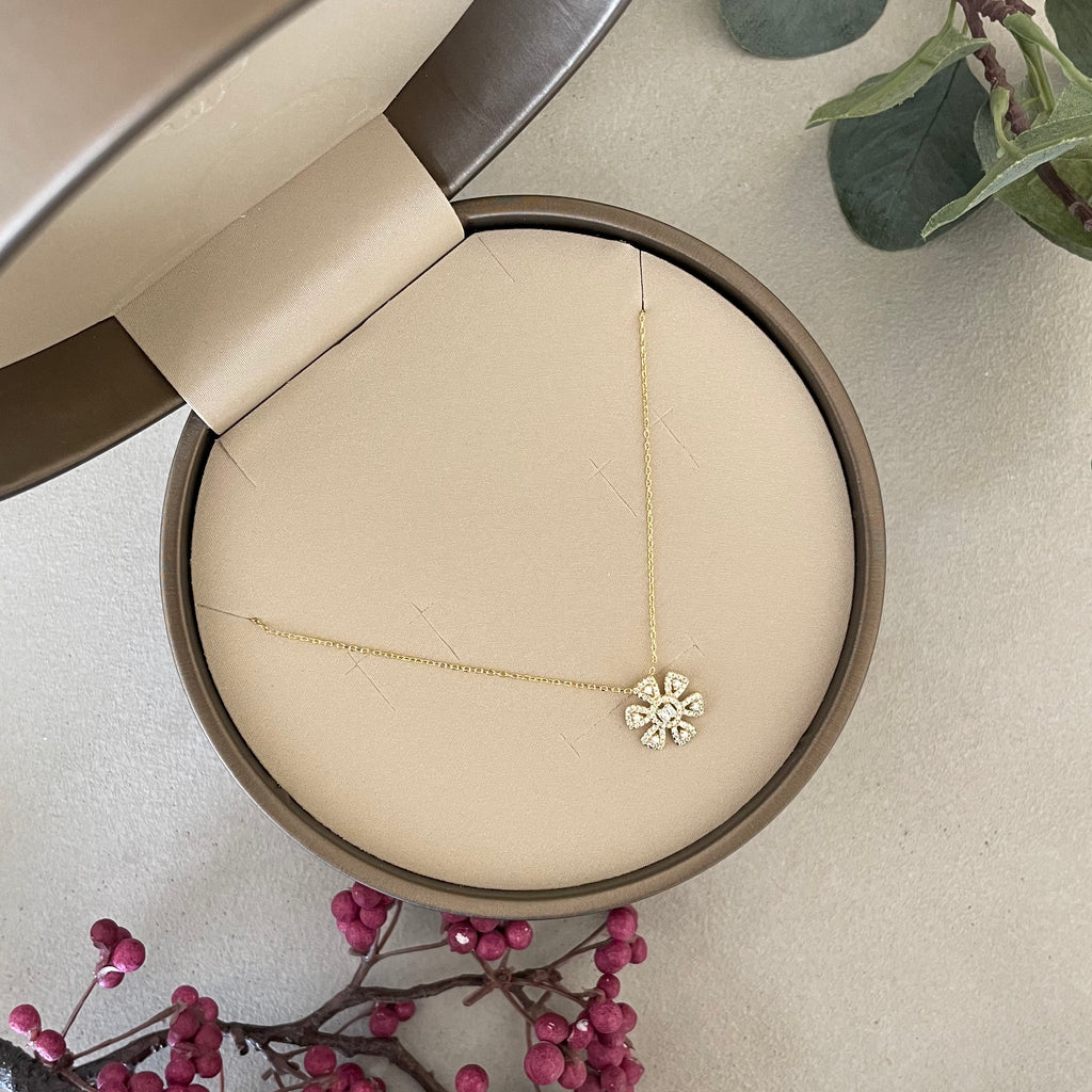تصنع كل قطعة وفقا لأعلى معايير الجودة وباستخدام أفضل المواد وأعلاها جودة. عقد رقيق وناعم من الفضة مطلي بالذهب عيار 18 مزين بفصوص ع دائرية متلألئة تطوق قلادة لامعة بكل أناقة .