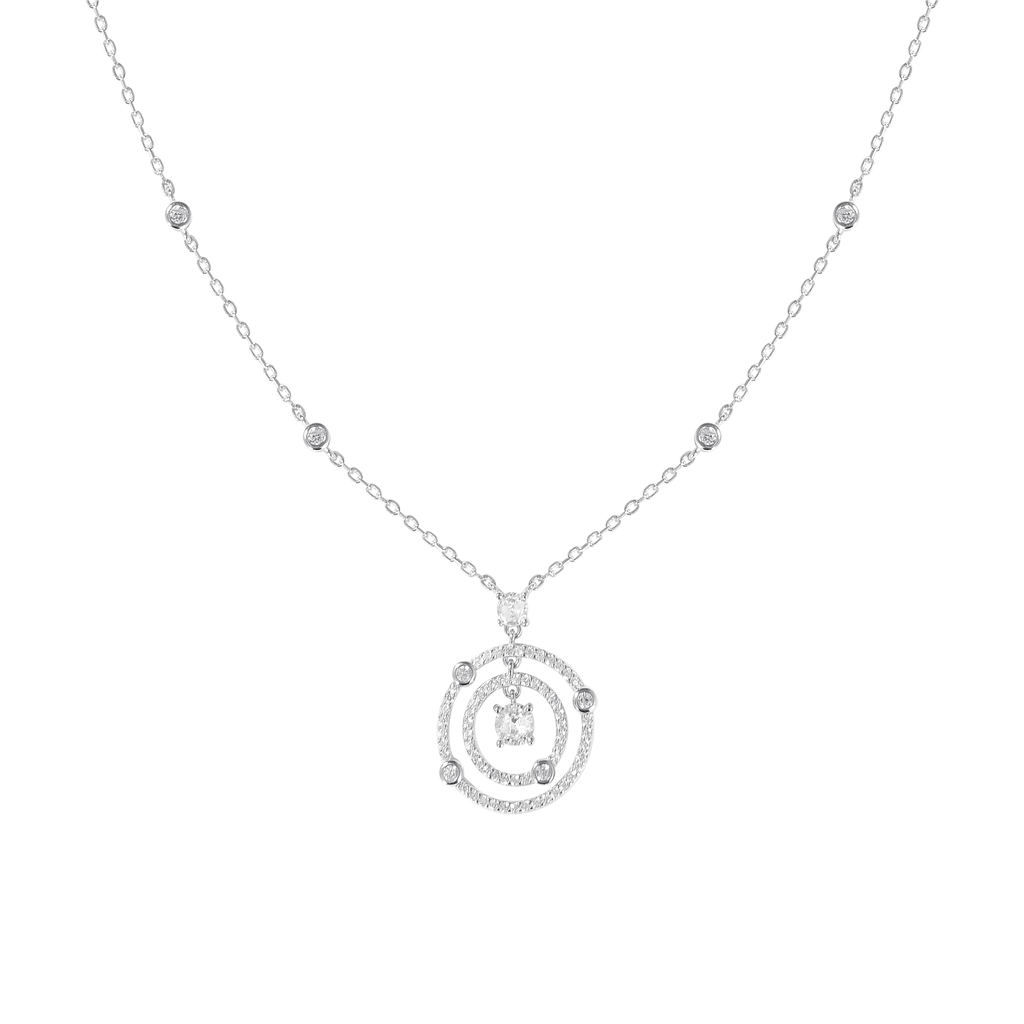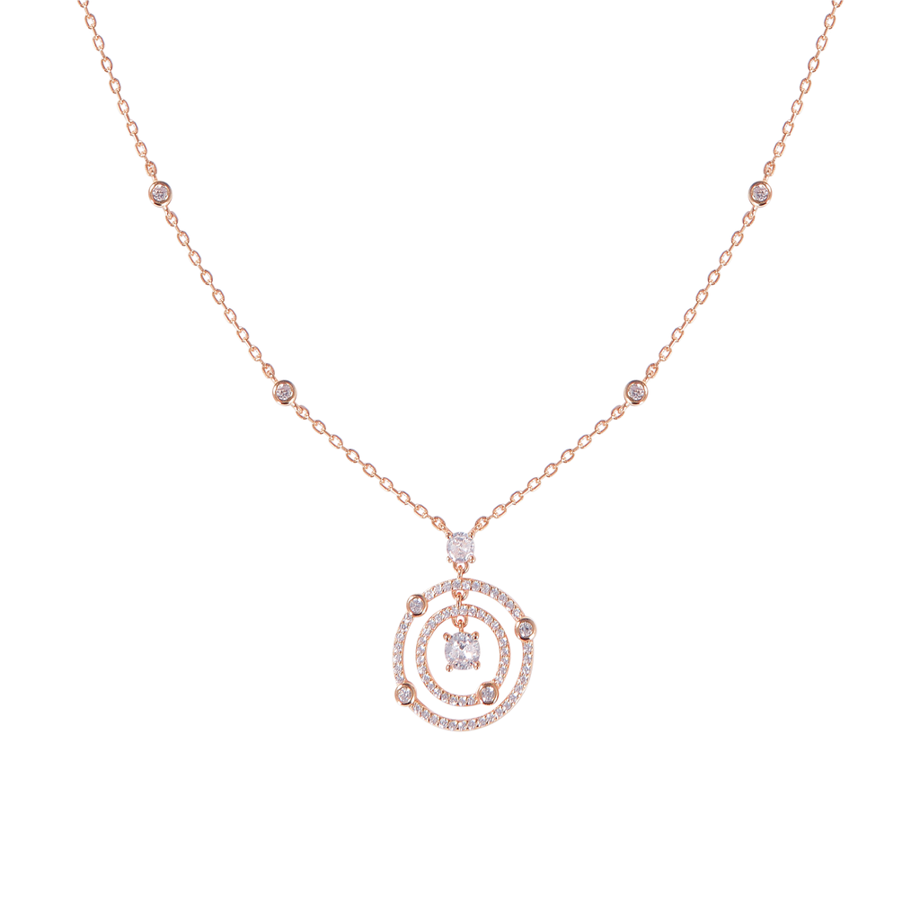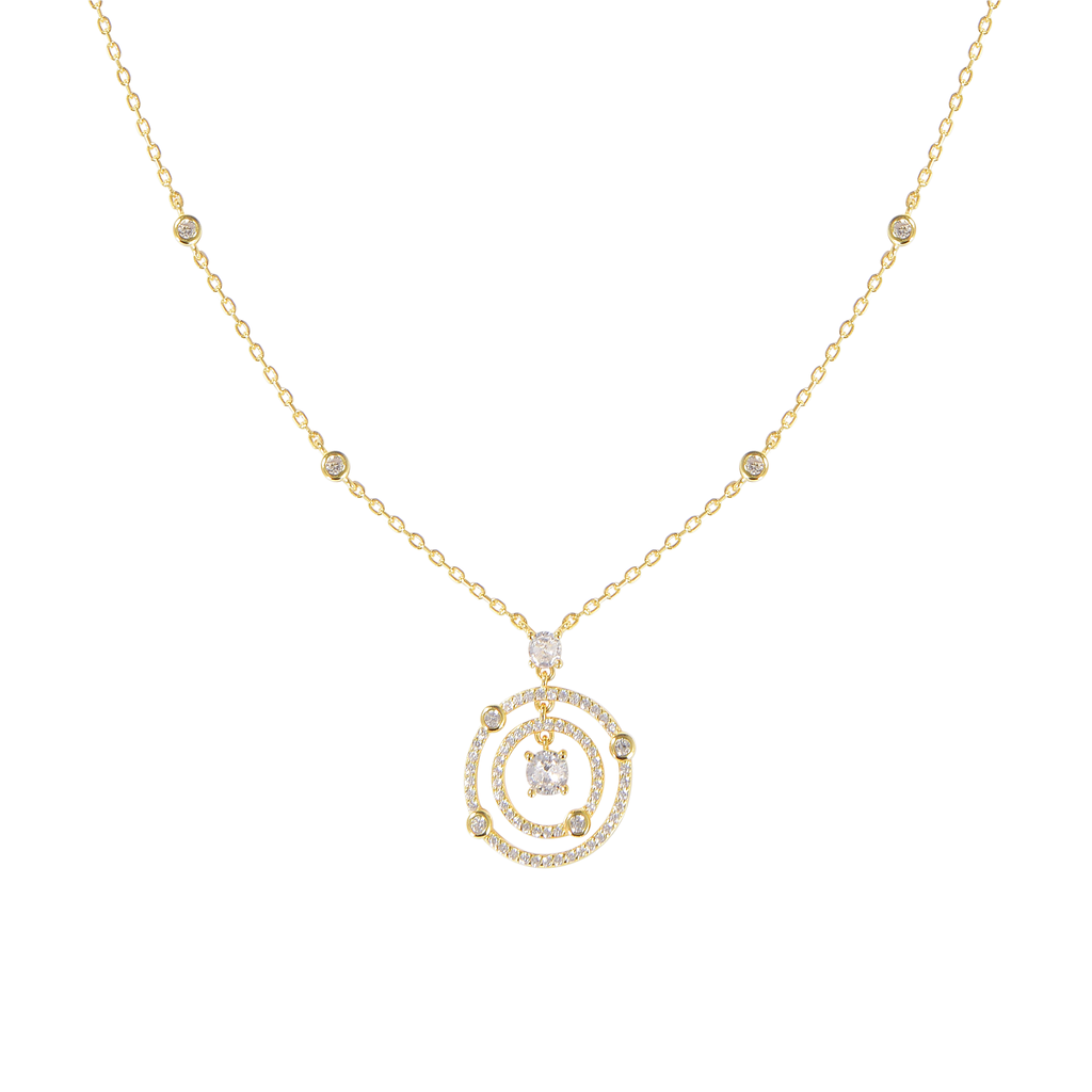 18k gold-plated necklace featuring drop-shaped pendant and free round shaped sparkles around the chain.