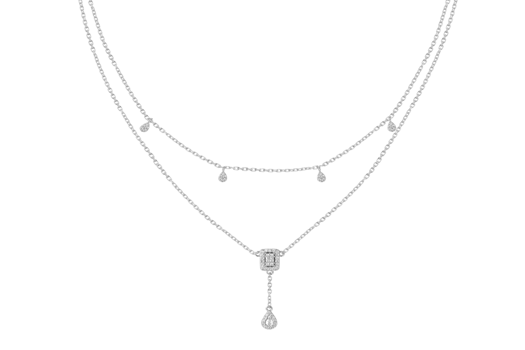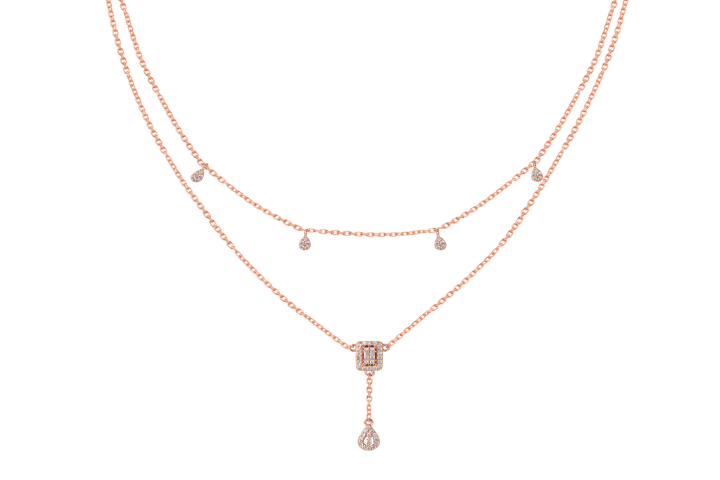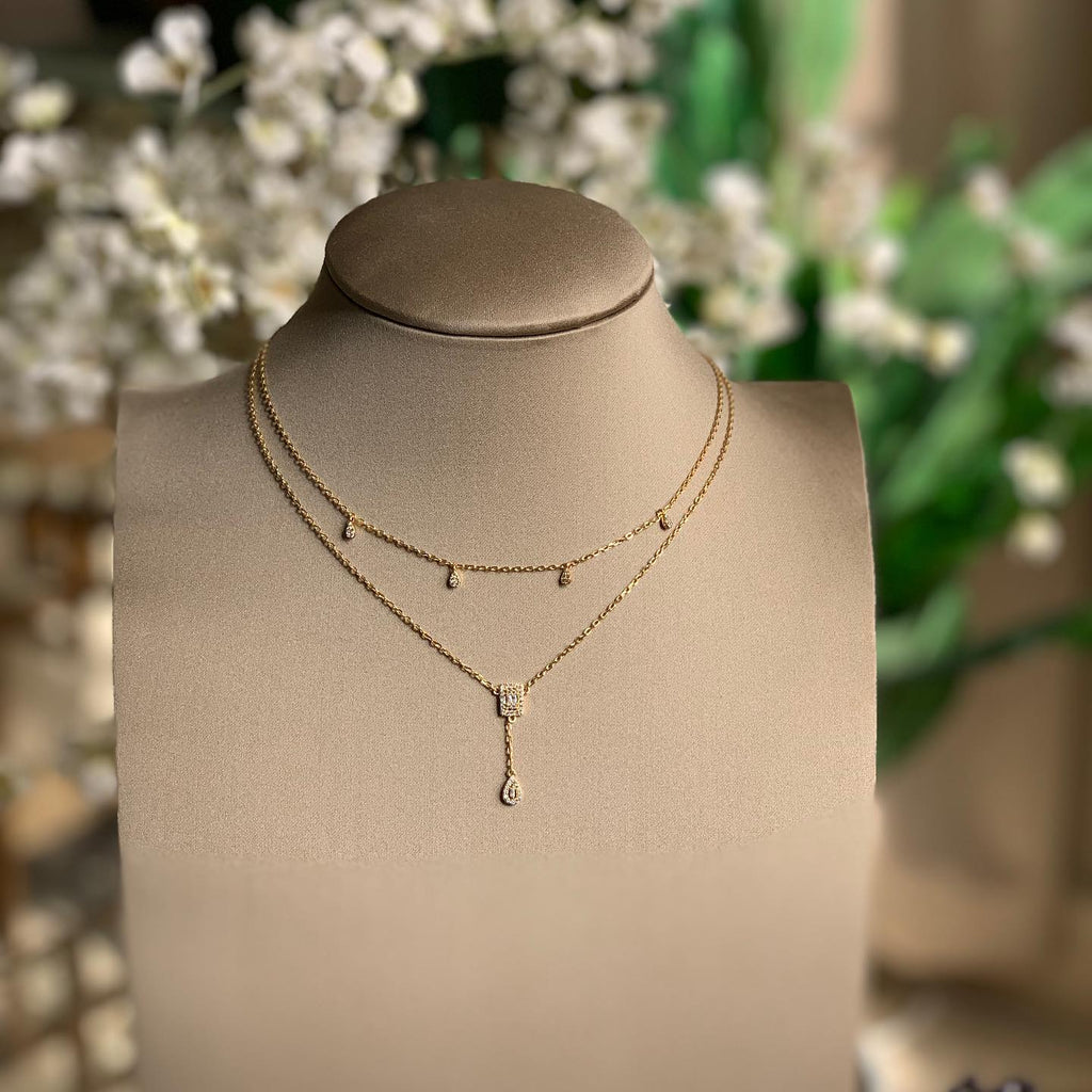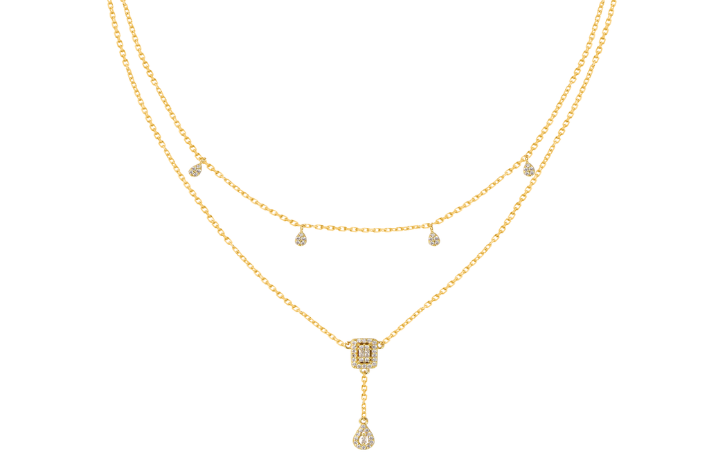 18k gold-plated necklace featuring pear-shaped drops with square-paved Swiss zircons.