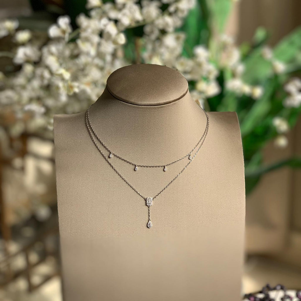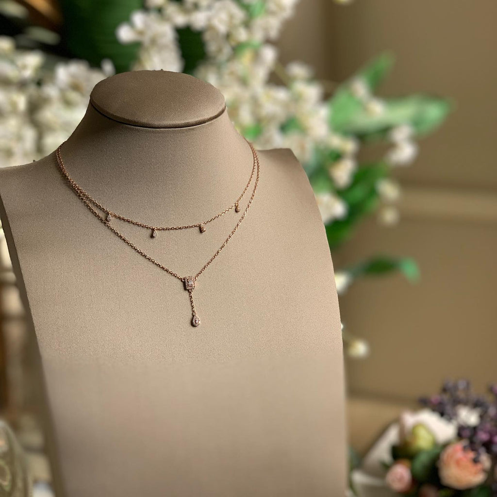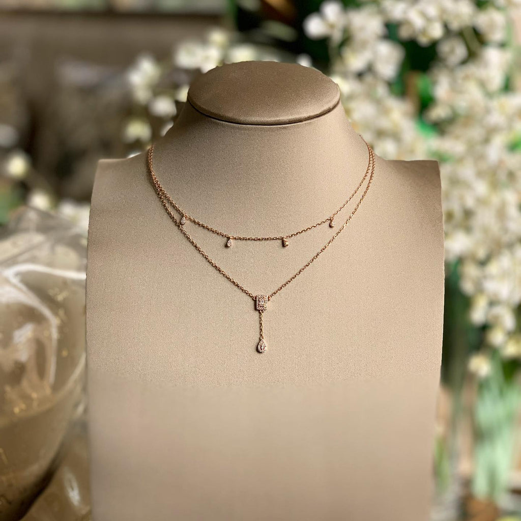 18k gold-plated necklace featuring pear-shaped drops with square-paved Swiss zircons.